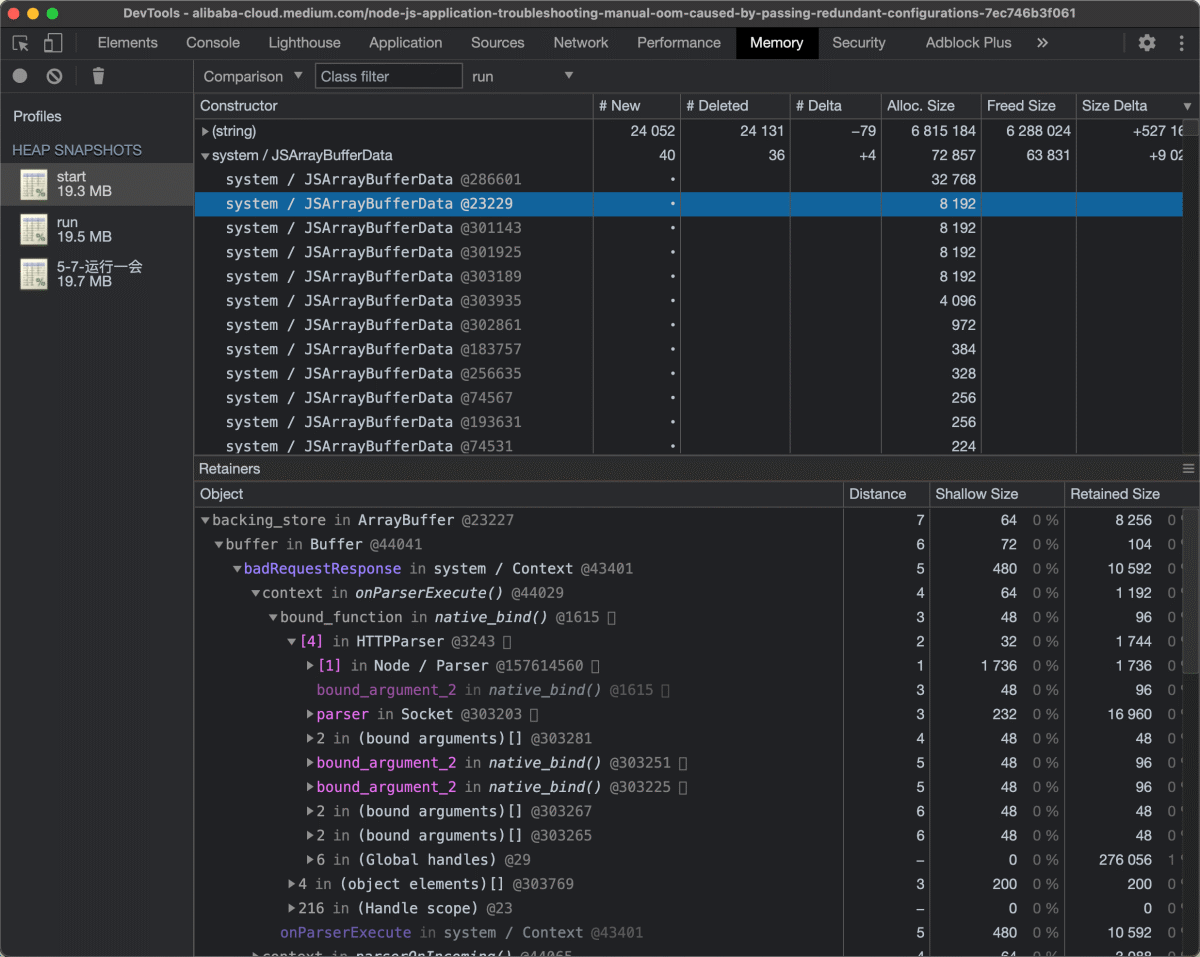 因为是内存原因导致的,而且有逐步持续上升的现象,所以就联想到了内存泄漏这个方向,常用的做法是打印「堆快照」即 heapsnapshot文件。